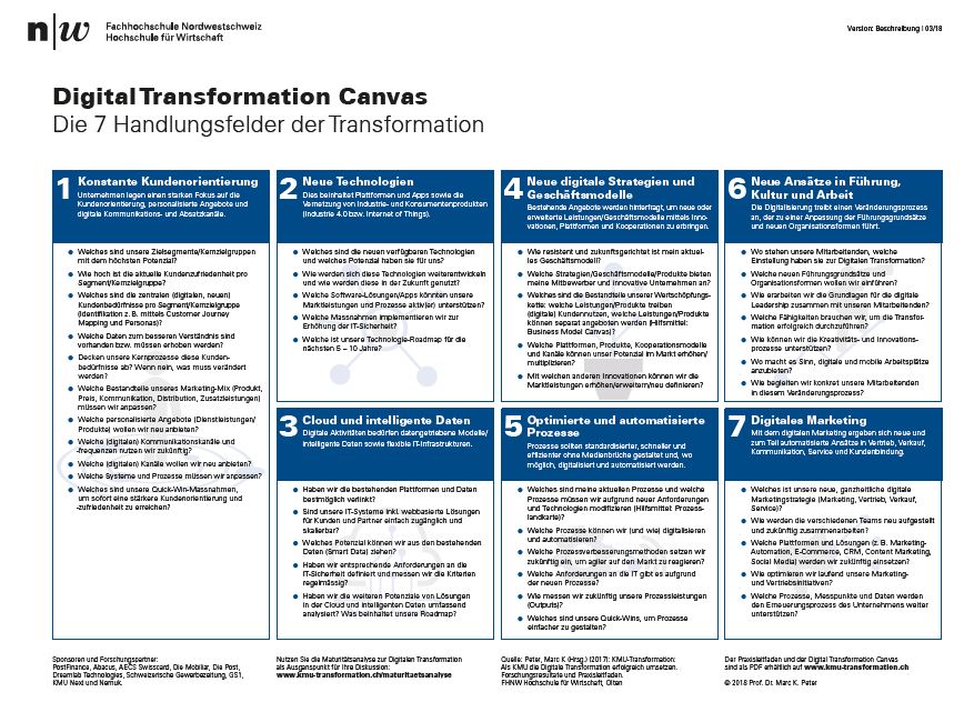 Um KMU bei ihren Vorhaben zu unterstützen, hat der Projektleiter, Prof. Dr. Marc K. Peter, einen Canvas (eine Leinwand bzw. ein Raster) mit den zentralen Fragestellungen für die sieben Handlungsfelder erstellt. Diese Fragen lenken, aufbauend auf einer Maturitätsanalyse, die Diskussion der aktuellen Firmensituation und erlauben damit die Identifikation von Marktpotenzial sowie möglichen Vorhaben, Projekten und Investitionen.