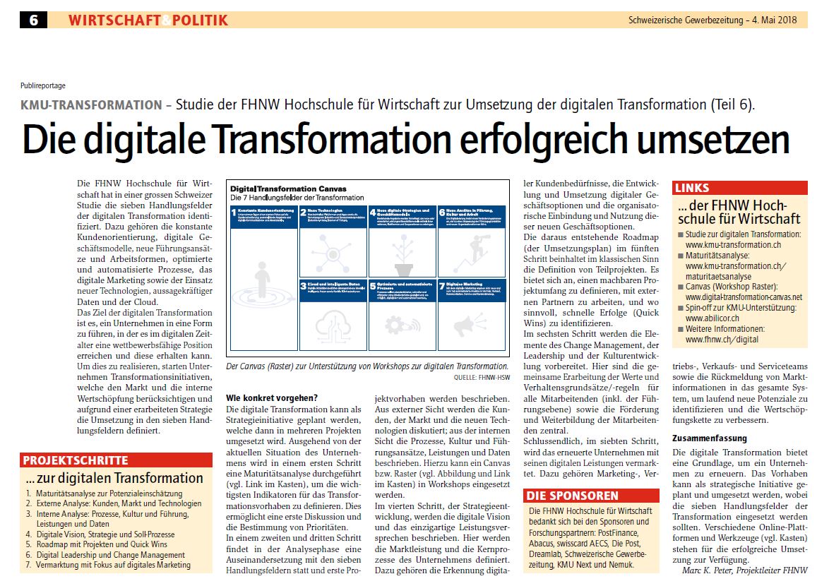 Die Studie der FHNW Hochschule für Wirtschaft zur Umsetzung der Digitalen Transformation (Teil 6) in der Gewerbezeitung vom 04.05.2018: Die Digitale Transformation kann als Strategieinitiative geplant werden, welche in mehreren Projekten umgesetzt wird. Im Zentrum der Transformation stehen die sieben Handlungsfelder, welche in der grossen Schweizer Studie identifiziert und beschrieben wurden.