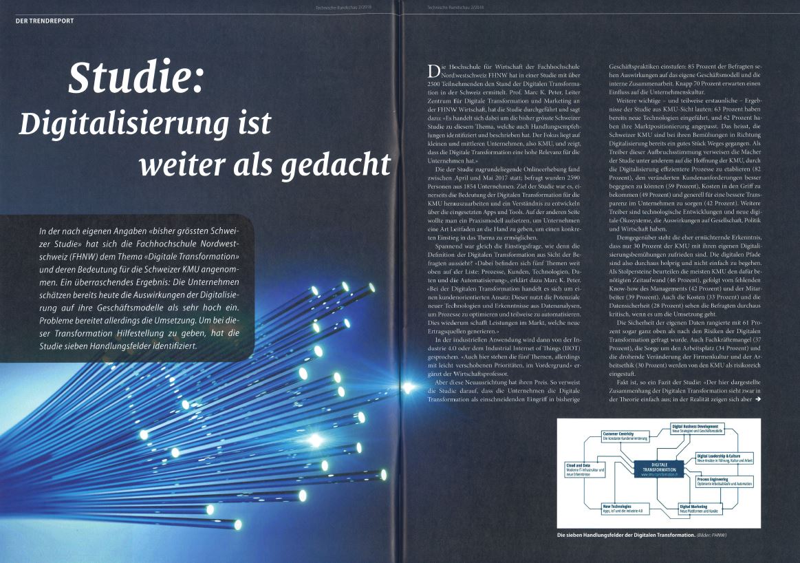 In der nach eigenen Angaben «bisher grössten Schweizer Studie» hat sich die Fachhochschule Nordwestschweiz (FHNW) dem Thema «Digitale Transformation» und deren Bedeutung für die Schweizer KMU angenommen. Ein überraschendes Ergebnis: Die Unternehmen schätzen bereits heute die Auswirkungen der Digitalisierung auf ihre Geschäftsmodelle als sehr hoch ein. Probleme bereitet allerdings die Umsetzung. Um bei dieser Transformation Hilfestellung zu geben, hat die Studie sieben Handlungsfelder identifiziert.