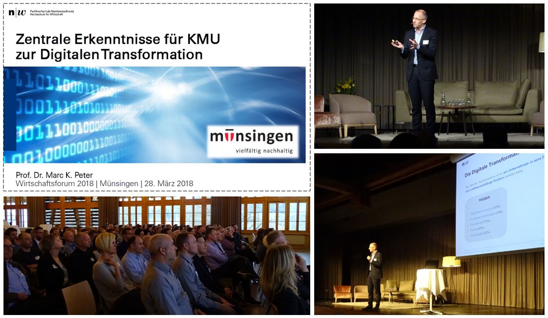 Am Wirtschaftsforum vom 28. März 2018 in Münsingen (Kanton Bern) präsentierte Prof. Dr. Marc K. Peter die zentralen Erkenntnisse für KMU zur Digitalen Transformation. Im Zentrum standen die sieben Handlungsfelder der Transformation sowie der Canvas, welcher KMU eine erste Orientierungshilfe bietet.